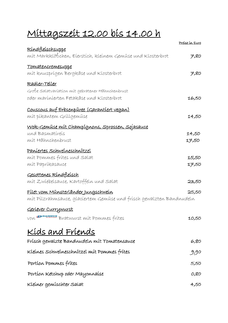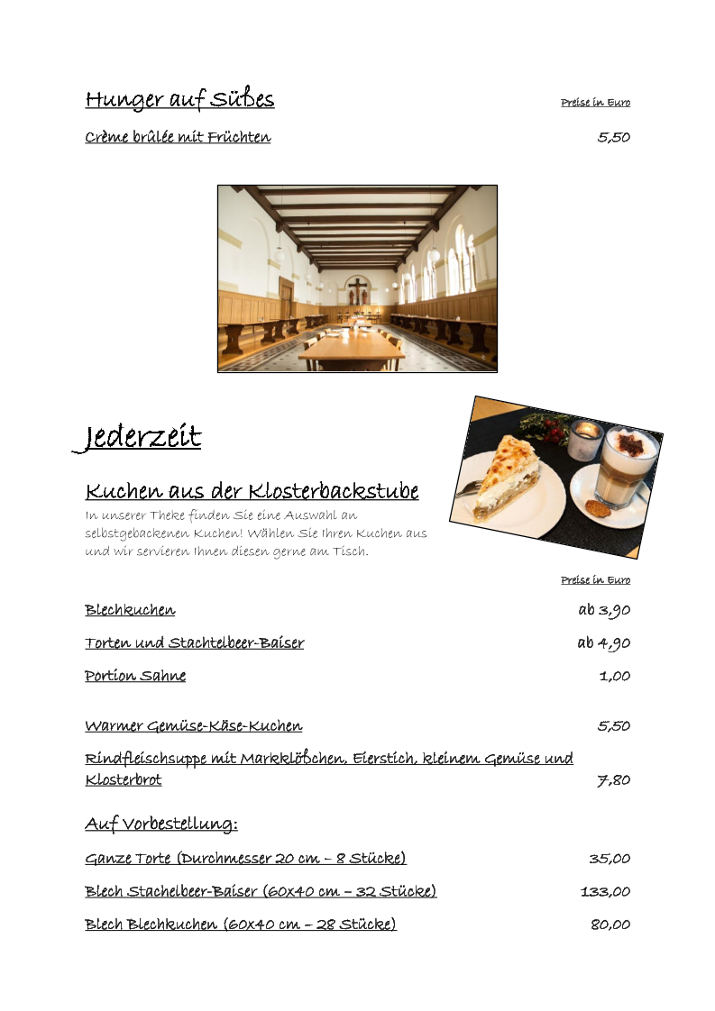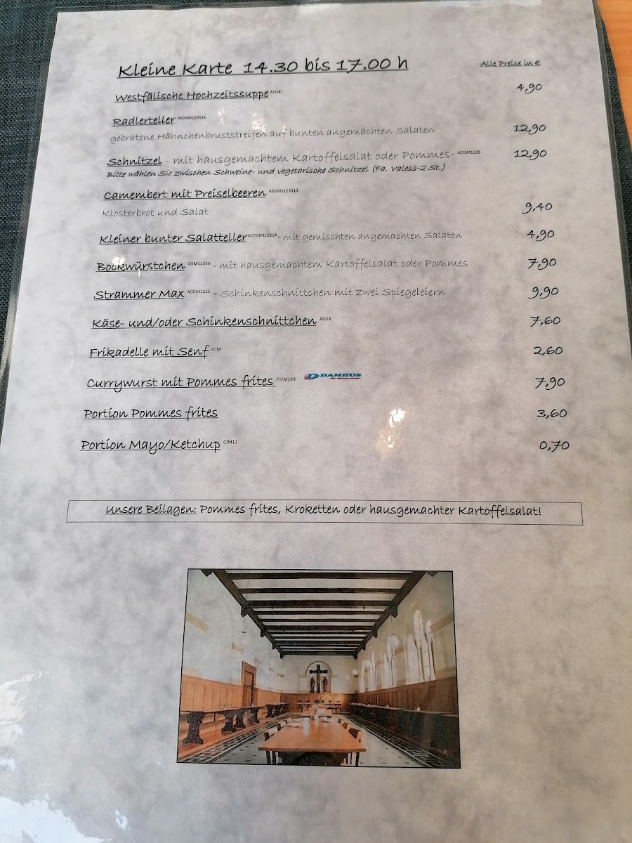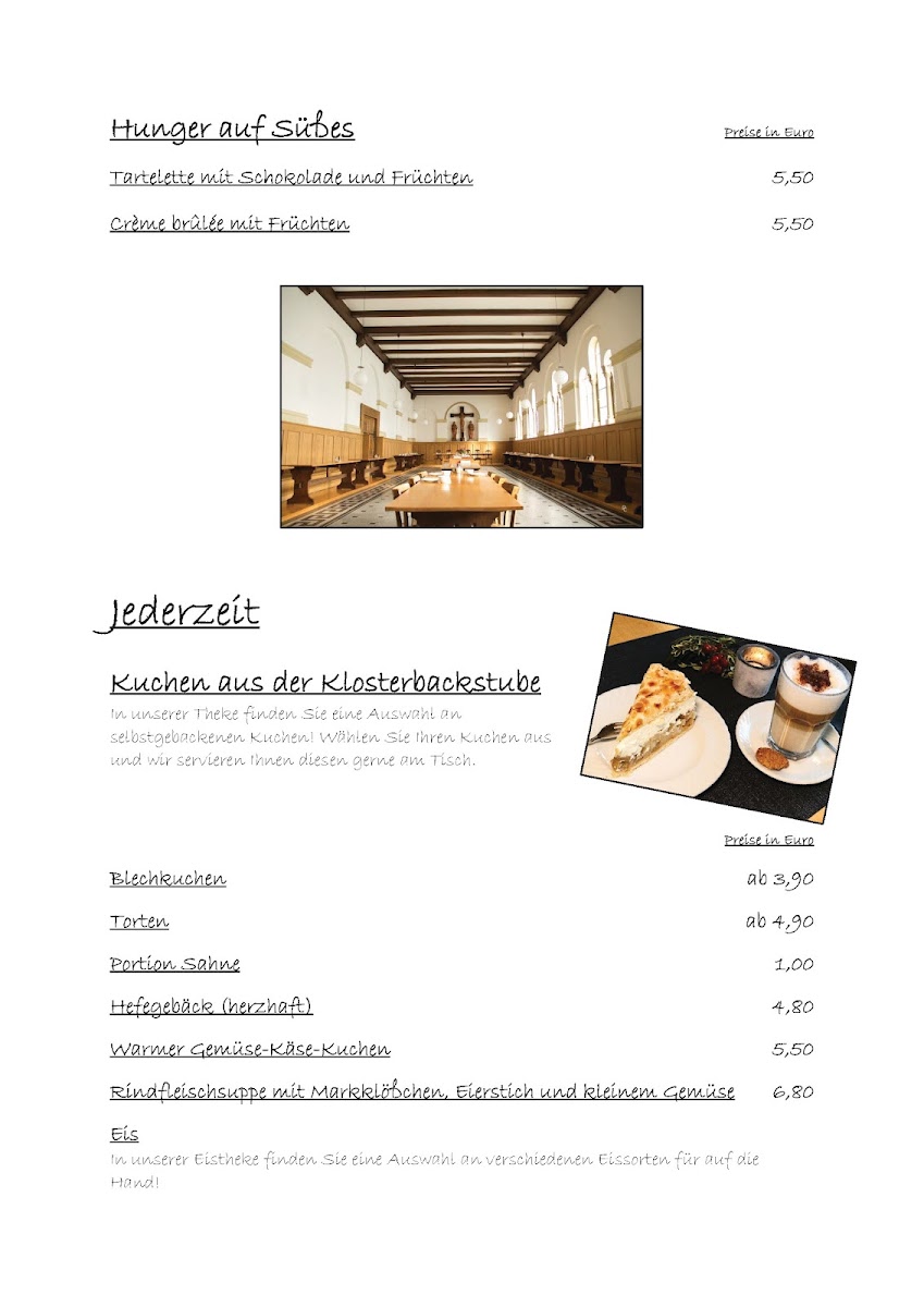 As a reviewer, my overall impression of the menu at Klostergaststätte Der Benediktinerabtei Gerleve is one of calm simplicity and thoughtful balance, perfectly matching the monastic setting. During lunchtime (12:00-14:00), the restaurant offers comforting starters such as Rindfleischsuppe and Tomatencremesuppe, alongside more substantial plates like the Radler-Teller. I particularly appreciate the clear inclusion of plant-based choices, with Couscous auf Erbsenpüree (Garantiert vegan) and Wok-Gemüse mit Champignons, Sprossen, Sojasauce providing lighter yet flavorful options. The midday menu also caters well to families: children and companions can enjoy familiar, satisfying dishes such as Frisch gewalzte Bandnudeln mit Tomatensauce, Kleines Schweineschnitzel mit Pommes frites, or a simple Portion Pommes frites served with Portion Ketchup oder Mayonnaise, complemented by a Kleiner gemischter Salat. For those with a sweet tooth at lunchtime, the Crème brûlée mit Früchten stands out as a gentle, elegant dessert. Beyond fixed meal times, the “Jederzeit” selection reinforces the restaurant’s welcoming nature, offering homemade-style treats like Blechkuchen, Torten, and Portion Sahne, as well as savory classics such as Warmer Gemüse-Käse-Kuchen and the hearty Rindfleischsuppe mit Markklößchen, Eierstich, kleinem Gemüse und Klosterbrot. Taken as a whole, the menu feels intentionally curated rather than extensive, focusing on quality, tradition, and approachability. It leaves the impression of a place where guests can enjoy honest, well-prepared food-whether stopping by for a quiet lunch, visiting with children, or simply savoring cake and coffee in a peaceful setting.