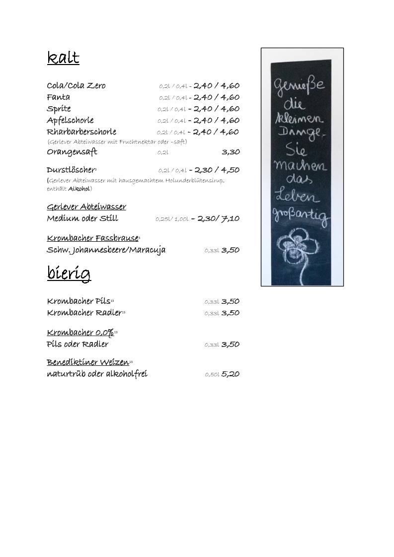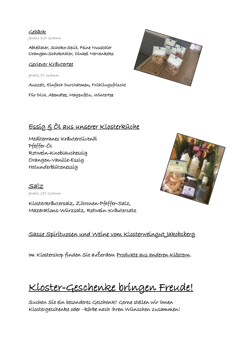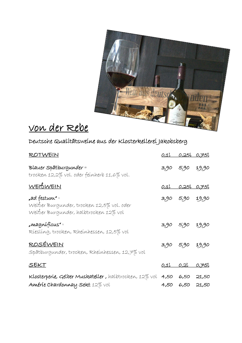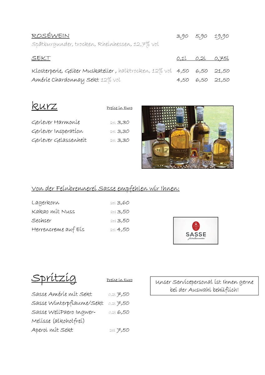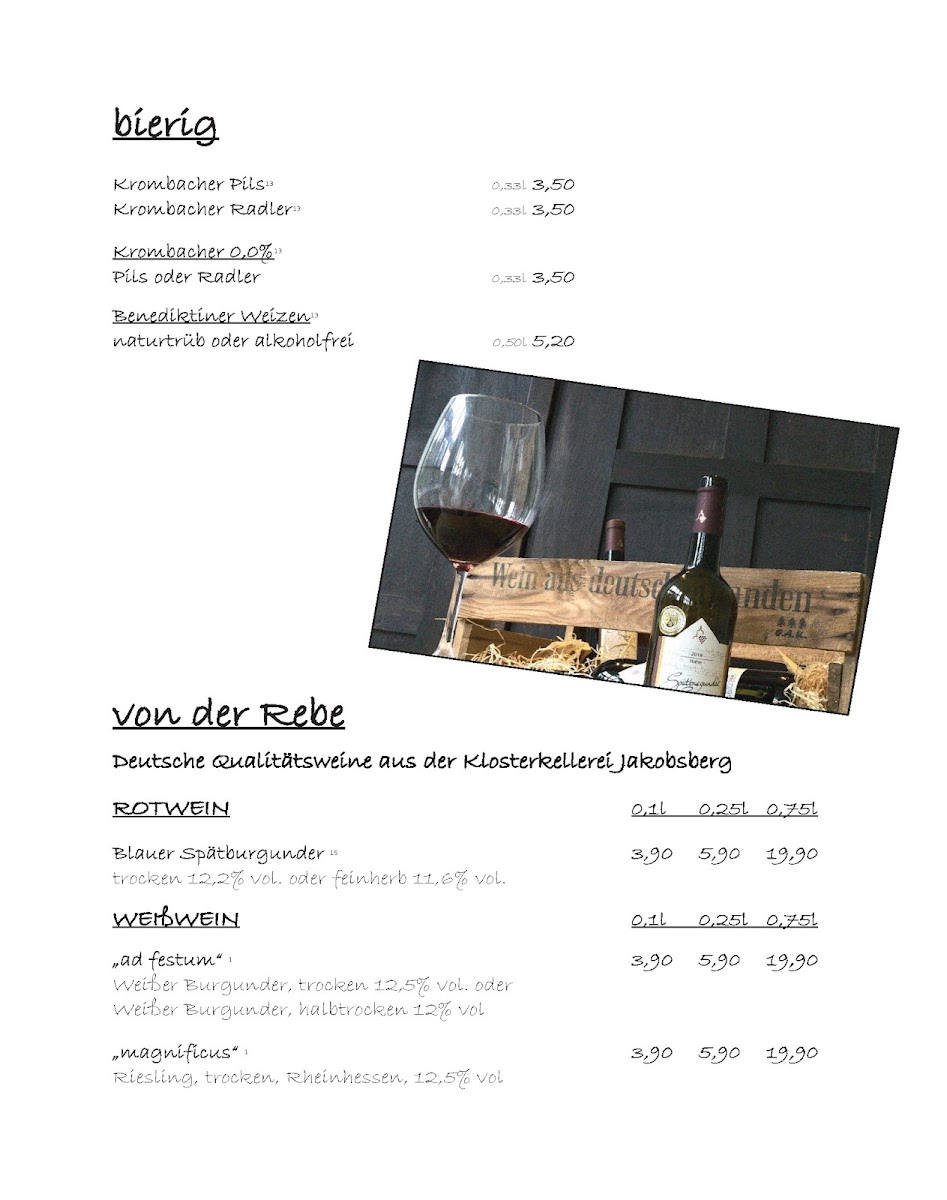 As a reviewer, my overall impression of the menu at Klostergaststätte Der Benediktinerabtei Gerleve is one of calm simplicity and thoughtful balance, perfectly matching the monastic setting. During lunchtime (12:00-14:00), the restaurant offers comforting starters such as Rindfleischsuppe and Tomatencremesuppe, alongside more substantial plates like the Radler-Teller. I particularly appreciate the clear inclusion of plant-based choices, with Couscous auf Erbsenpüree (Garantiert vegan) and Wok-Gemüse mit Champignons, Sprossen, Sojasauce providing lighter yet flavorful options. The midday menu also caters well to families: children and companions can enjoy familiar, satisfying dishes such as Frisch gewalzte Bandnudeln mit Tomatensauce, Kleines Schweineschnitzel mit Pommes frites, or a simple Portion Pommes frites served with Portion Ketchup oder Mayonnaise, complemented by a Kleiner gemischter Salat. For those with a sweet tooth at lunchtime, the Crème brûlée mit Früchten stands out as a gentle, elegant dessert. Beyond fixed meal times, the “Jederzeit” selection reinforces the restaurant’s welcoming nature, offering homemade-style treats like Blechkuchen, Torten, and Portion Sahne, as well as savory classics such as Warmer Gemüse-Käse-Kuchen and the hearty Rindfleischsuppe mit Markklößchen, Eierstich, kleinem Gemüse und Klosterbrot. Taken as a whole, the menu feels intentionally curated rather than extensive, focusing on quality, tradition, and approachability. It leaves the impression of a place where guests can enjoy honest, well-prepared food-whether stopping by for a quiet lunch, visiting with children, or simply savoring cake and coffee in a peaceful setting.